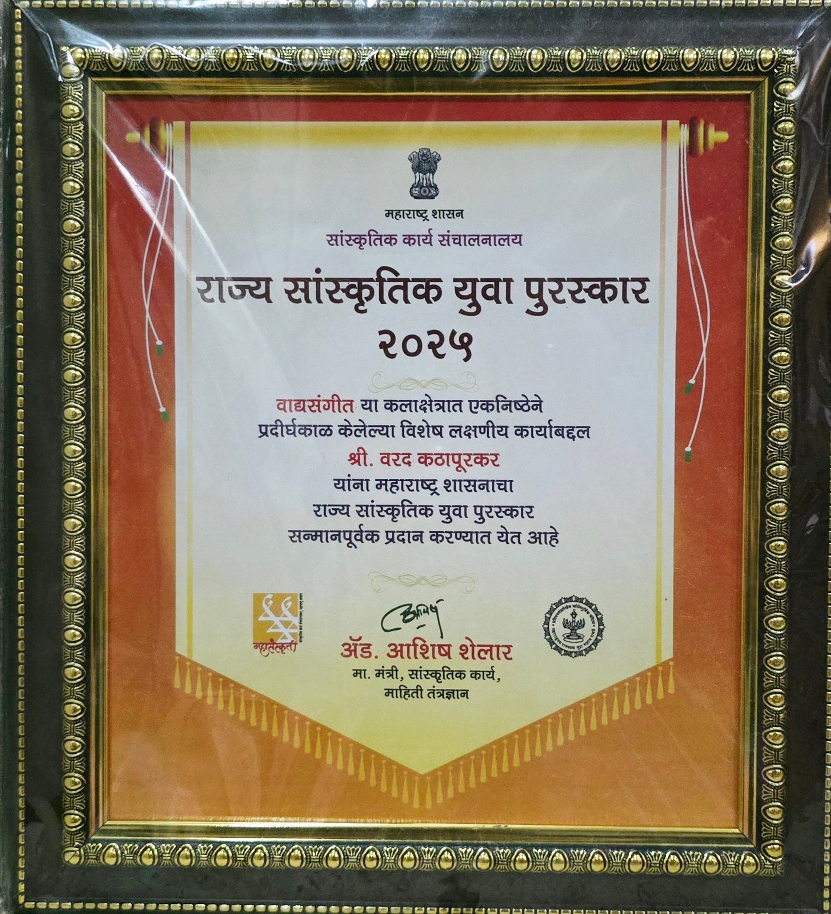 ● Varad has been recognized with the 2025 Maharashtra State Cultural Youth Award, an honor bestowed by the esteemed Minister of Cultural Affairs, Mr. Aashish Shelar, in acknowledgment of his significant contributions to the domain of musical instrumentation.